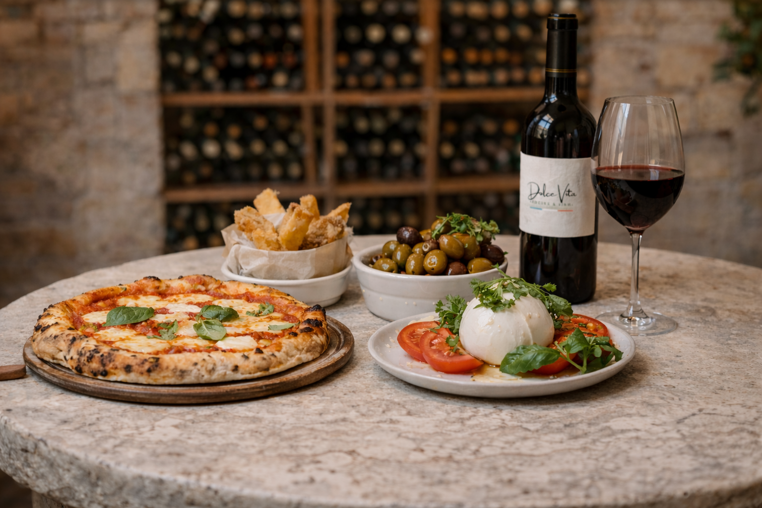 Tomate San Marzano, mozzarella, gambas, calamar y mejillones, rematado con perejil y aceite de oliva